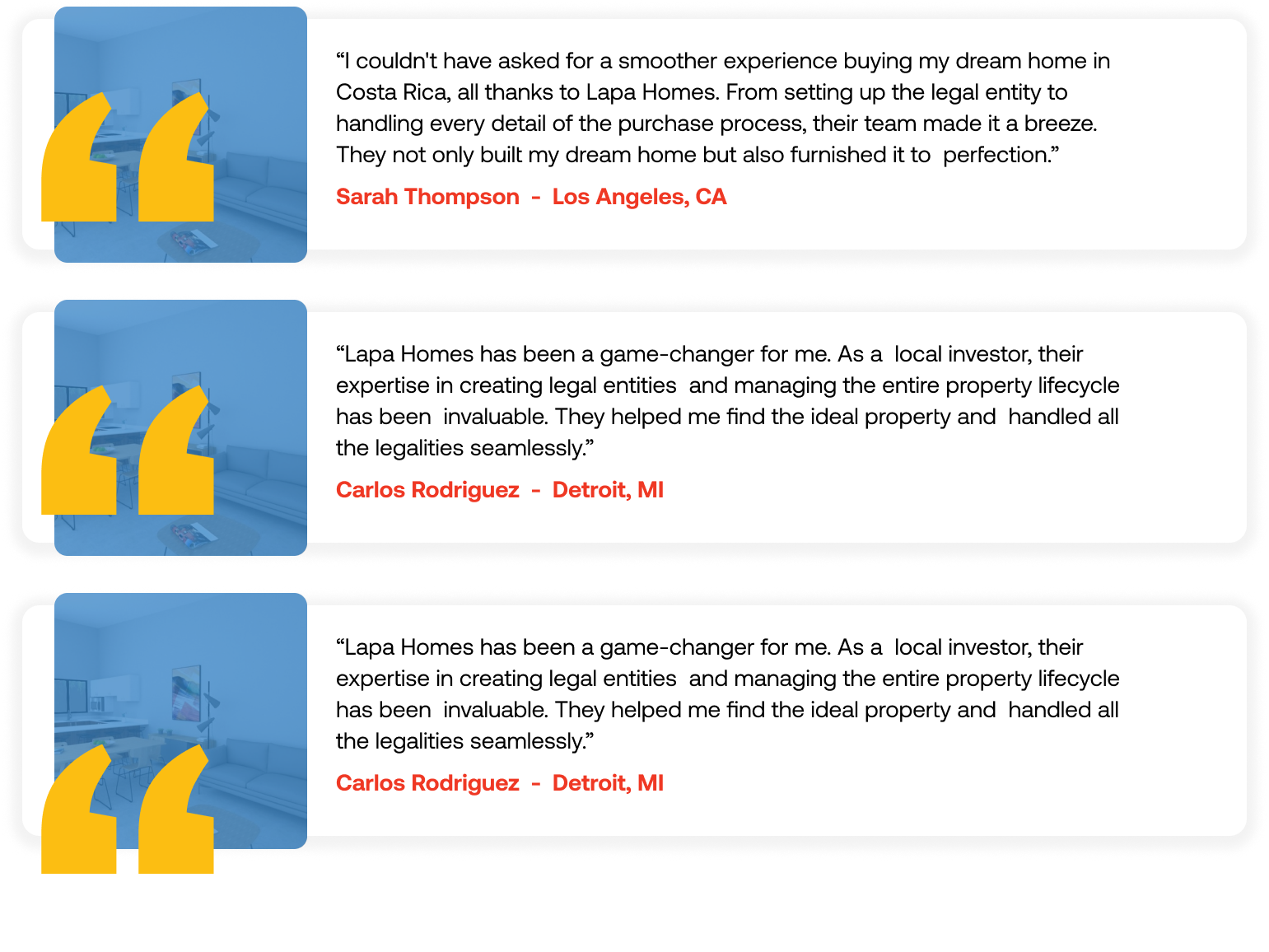 “I couldn’t have asked for a smoother experience buying my dream home in Costa Rica, all thanks to Lapa Homes. From setting up the legal entity to handling every detail of the purchase process, their team made it a breeze. They not only built my dream home but also furnished it to perfection.”
